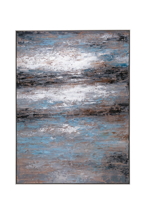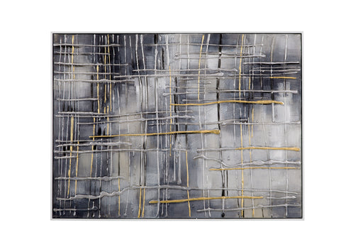 Bassett Mirror Co.Logistics is a hand painted highly textured mixed media gallery wrapped canvas with gold and silver metallic paint accents.