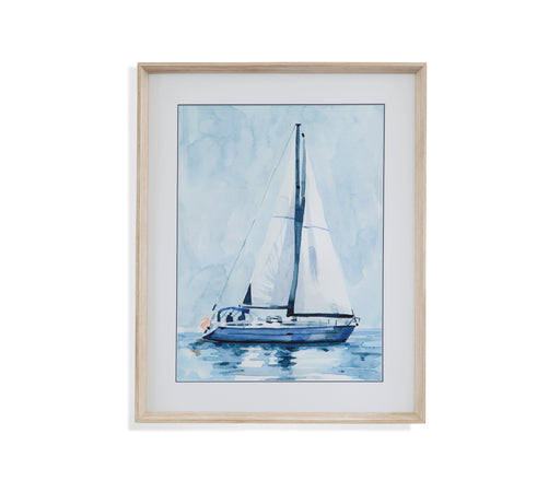 Bassett Mirror Co.Lone Sailboat I features a matt paper print with a blue and white double mat and a washed warm greige 1" molding.