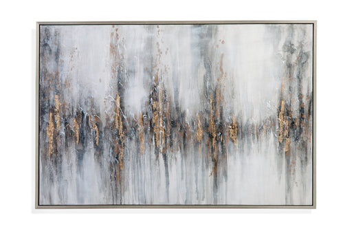 Bassett Mirror Co.Ship Yard is a hand-painted abstract canvas presented in a floating champagne frame.