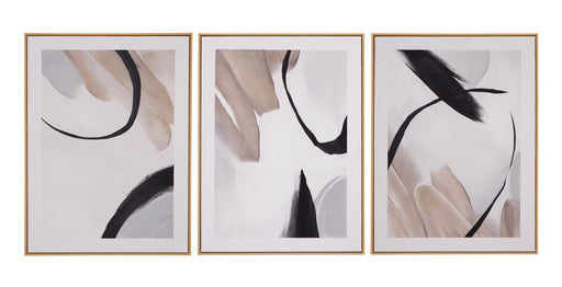 Bassett Mirror Co.Estatic is a set of three hand-painted canvases gracefully displayed within a floating silver frame.