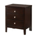 The Lawrence Nightstand keeps your belongings stylishly stored away. This bedside staple features clean, sleek lines throughout; making a staple in your home for years to come. This nightstand comes with three, spacious drawers; perfect for storing away all of your belongings. Silver metal drawer knobs complete the look of the drawers, and pair perfectly with the rich, antique black finish.