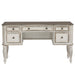 Start your mornings off by utilizing this charming vanity desk. The weathered brown whitewash top paired with the antique white finish and antique pewter knob hardware creates a truly unique look. Five full extension fully stained drawers allow you to store all your accessories, with two dividers located in the side drawers to help with organization. This unique piece is the perfect finish touch to any space.