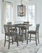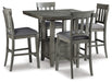Details D589-42: Made with hardwood solids, select acacia veneer and engineered wood, Antiqued gray finish, Storage base, Removable leaf, Seats up to 6, Assembly required, D589-124: Made with solid wood, Antiqued gray finish, Upholstered in gray textural polyester fabric, Cushioned foam seat, Contoured comb-back design, Assembly required,