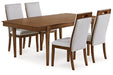 Details D615-45: Made with hardwood solids, mango wood veneer and MDF substrate, Medium brown wood-tone finish, Seats up to 8, Removable center leaf, Table extends by pulling both ends and dropping in leaf, Round tapered legs, Dining chairs sold separately, D615-05: Made with solid hardwood frame, Medium brown wood-tone finish, Polyester upholstery, Foam cushion, Chair back with cutout handle, Tapered legs,