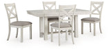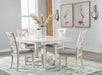 Details D642-01: Made with solid wood frame, Antiqued white finish with grain texture, Light gray polyester upholstery, Nailhead trim, X-back, Assembly required, D642-45: Made with rubberwood solids, ash veneer and MDF substrates, Antiqued white finish with grain texture, Tabletop with planked effect, Two 12" removable center leaves, Table extends to 86" overall by pulling both ends and dropping in leaves, Seats up to 8, Assembly required,