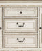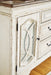 Details | Made of veneers, wood and engineered wood, Antiqued two-tone finish, 3 smooth-gliding drawers with dovetail construction and felt bottoms, Bail pulls and knobs in dark bronze tone finish, Pair of cabinet doors with inset mirrored glass and decorative fretwork, 2 adjustable shelves, Assembly required | |