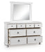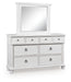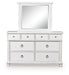 Details | Includes dresser and mirror, Dresser made with hardwood solids, veneers and MDF substrates , Mirror made with solid wood, Rubbed antiqued white finish, Metal hardware with pewter-tone finish, 8 smooth-gliding drawers with fully finished interiors, French/English dovetail construction and heavy-duty ball-bearing side glides, Top drawers felt lined, Mirror attaches to back of dresser | |