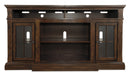 The beauty of this TV stand will immediately engage you. Its slight breakfront shape is a rare find and an ideal fit among traditional and eclectic tastes. Soft black undertones highlight the warm finish. Multiple cubbies and glass-door enclosed shelves organize your audio/video components and plenty of extras. And what really turns up the heat: an electric infrared fireplace insert with faux firebrick surround that operates with or without infrared heat. With the touch of a button, adjust the temperature and the flame brightness, and set the timer for long-lasting enjoyment.
