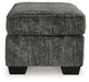 This ottoman speaks to those drawn to fresh, contemporary style with richly neutral appeal. Its firmly cushioned top offers room for comfort. Subtle and sophisticated, the plush upholstery and dark tri-block legs are a natural complement for so many color schemes.