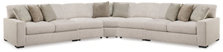 Details | Includes 5 pieces: left-arm facing loveseat, 2 armless chairs, wedge and right-arm facing loveseat, "Left-arm" and "right-arm" describe the position of the arm when you face the piece, Corner-blocked frame, Loose reversible seat and back cushions, High-density foam cushions wrapped in feather-fiber blend jacket, Accent pillows included, Pillows with feather-fiber blend, Polyester upholstery, Exposed legs with faux wood finish, Platform foundation system resists sagging 3x better than spring system after 20,000 testing cycles by providing more even support, Smooth platform foundation maintains tight, wrinkle-free look without dips or sags that can occur over time with sinuous spring foundations | |