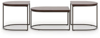 Details Includes coffee table and 2 end tables, Frame made with tubular metal; top made with wood veneer on MDF substrate, Frame with durable anodized bronze-tone powder coat finish, Top with medium-brown wood-tone finish, Nesting design, Assembly required