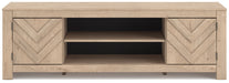 This TV stand embraces a classically charming aesthetic and repurposes it for modern living. Its light replicated wood grain appeals to your love of vintage character, while the chic chevron pattern is effortlessly on trend. And with hidden storage behind the doors, your media accessories stay tucked away in style.