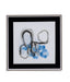 Pendelum Overlap III features abstract image in grays and blues on a light gray background with a black matte and white and silver shadowbox frame.