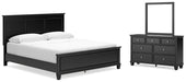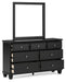 Details B687B9: Includes California king panel headboard, footboard and rails, Made with hardwood solids, birch veneer and MDF substrate, Black painted finish, Thick profiled tops, Tapered feet, Foundation/box spring required, sold separately, Mattress available, sold separately, Assembly required, Bed is compatible with an adjustable base, B687B1: Includes dresser and mirror, Made with hardwood solids, birch veneer and MDF substrate, Black painted finish, 7 smooth-gliding drawers with dovetail construction and ball-bearing side glides, Round metal drawer knobs with satin nickel-tone finish, Framed drawer fronts, Tapered feet, Mirror attaches to back of dresser, Assembly required,
