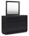 | Details | B768B4: Includes headboard, footboard and rails, Made with pine solids, veneers and engineered wood substrate, Textured black wood stain with waxy topcoat, Extra wide rails for a bench-like wrap around, Foundation/box spring required, sold separately, Mattress available, sold separately, Assembly required, B768B1: Includes dresser and mirror, Made with pine solids, veneers and engineered wood substrate, Textured black wood stain with waxy topcoat, Hardware-less design, 6 drawers with fully finished interiors, dovetail construction and ball-bearing side glides (top drawers felt lined), Mirror attaches to back of dresser, | |