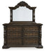 | Details | B947B4: Includes upholstered panel headboard, upholstered panel footboard and panel rails, Made with hardwood solids, oak and ash swirl veneers, MDF substrates and cast resin components, Dark brown finish, Polyester upholstery with button tufting, Foundation/box spring required, sold separately, Mattress available, sold separately, Assembly required, B947B1: Includes dresser and mirror, Made with hardwood solids, oak and ash swirl veneers, MDF substrates and cast resin components, Dark brown finish, 6 smooth-gliding drawers with dovetail construction (top drawer felt lined), Drawer pulls with antiqued goldtone finish, Mirror attaches to back of dresser, | |