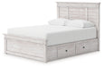 Details Includes panel headboard, panel footboard, 2 under bed storage units and roll slats , Made with engineered wood (MDF/particleboard/plywood) and decorative laminate for the right balance of affordability and durability, Whitewash replicated worn through paint over replicated wood grain with authentic touch, Decorative laminate replicates natural or man-made material surfaces with consistent color, pattern and texture, Handles with dark bronze-tone finish, 4 smooth-gliding storage drawers, Bed does not require additional foundation/box spring; accommodates most zero clearance adjustable bases with the addition of a bunkie board , Mattress available, sold separately, Assembly required