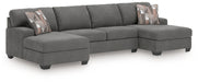 Details | Includes 3 pieces: left-arm facing corner chaise, armless loveseat and right-arm facing corner chaise, "Left-arm" and "right-arm" describe the position of the arm when you face the piece , Corner-blocked frame , Attached back and loose seat cushions, High-quality foam cushions wrapped in poly fiber, Accent pillows included, Pillows with soft polyfill, Polyester upholstery, Exposed feet with faux wood finish , Platform foundation system resists sagging 3x better than spring system after 20,000 testing cycles by providing more even support, Smooth platform foundation maintains tight, wrinkle-free look without dips or sags that can occur over time with sinuous spring foundations | |