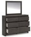 Details PCB3370B2: Includes headboard panel, headboard posts, footboard and rails, Made with engineered wood (MDF/particleboard/plywood) and decorative laminate for the right balance of affordability and durability , Dark charcoal finish over replicated oak grain, Decorative laminate replicates natural or man-made material surfaces with consistent color, pattern and texture, Foundation/box spring required, sold separately, Mattress available, sold separately, Assembly required, PCB3370B1: Includes dresser and mirror, Made with engineered wood (MDF/particleboard/plywood) and decorative laminate for the right balance of affordability and durability , Dark charcoal finish over replicated oak grain, Decorative laminate replicates natural or man-made material surfaces with consistent color, pattern and texture, Recessed hand grabs create hardware-less effect, 6 smooth-gliding drawers, Drawer interiors are lined with a faux linen laminate for a clean, finished look , Safety is a top priority, clothing storage units are designed to meet the most current standard for stability, ASTM F 2057 (ASTM International), Drawers extend out to accommodate maximum access to drawer interior while maintaining safety, Mirror attaches to back of dresser; can also be mounted on wall horizontally or vertically, Assembly required,