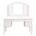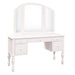 Live life beautifully with the Summer House I vanity desk, mirror, and stool. Crafted of poplar and pine solids this kit features an oyster white finish, bead molding, full extension drawers with felt lined top drawers, turned legs, and is accented with wooden knob hardware. The vanity desk features five drawers for storage and pairs well with the trifold mirror with a beveled edge. Sit in comfort with the vanity stool that has a linen upholstered seat and nylon chair glides to protect your flooring. With cottage design always in fashion, make the Summer House I a staple in your home.