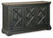 Invite your family into the heart of your home with this dining room server. Its beautifully textured black finish and timeworn planked oak top create a unique two-tone contrast. A charming lattice design graces the front of the doors. Thick pilasters add to the sturdiness of the foundation. And cabinets offer plenty of storage space for essentials. This is trend-right urban farmhouse style.